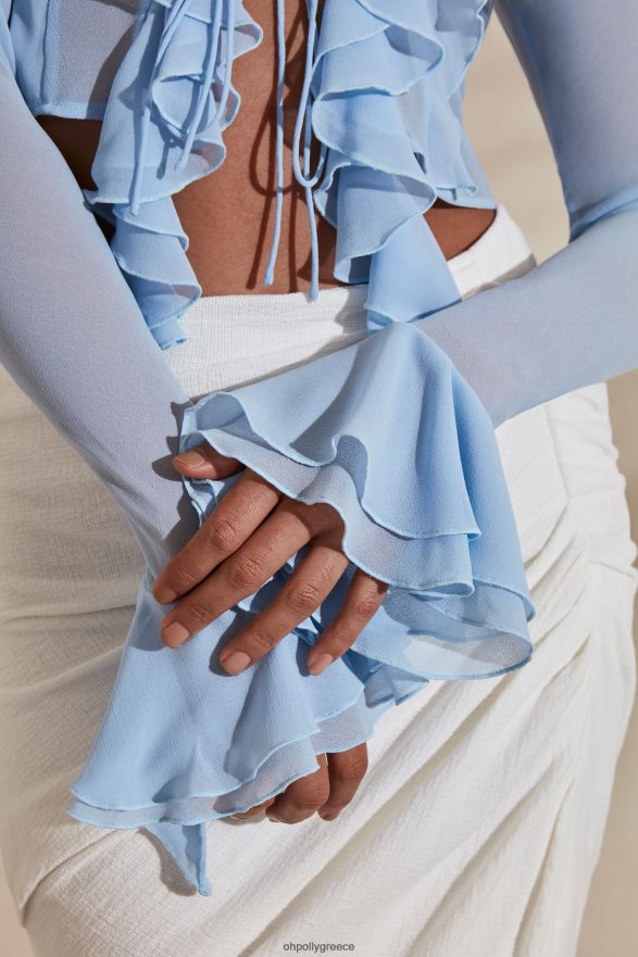 ημιδιάφανη, αιωρούμενη και ολοκληρωμένη με περίτεχνα βολάν, η μπλούζα dionis είναι εδώ για να αναδείξει το δράμα στην καλοκαιρινή σας γκαρνταρόμπα. Αναμφισβήτητα σέξι, αυτό το ημιδιαφανές crop top διαθέτει μια βουτιά λαιμόκοψη που πλαισιώνεται με λεπτές βολάν που εκτείνονται πέρα από το στρίφωμα. πλήρης με τρία ντελικάτα κουμπώματα στο μπροστινό μέρος και μακριά μανίκια που τονίζονται με περισσότερες λεπτομέρειες με βολάν, δημιουργώντας μια δελεαστική εορταστική εμφάνιση δεν ήταν ποτέ πιο εύκολη.
